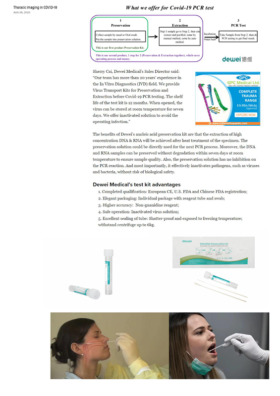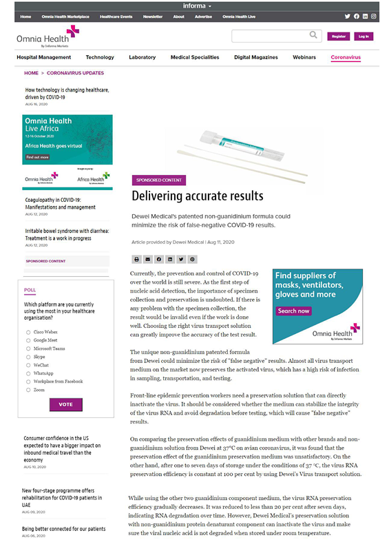 2020年8月11日的Omnia Health上表示了对德维采样管的肯定。(Omnia Health 报道链接:https://insights.omnia-health.com/coronavirus-updates/delivering-accurate-results)